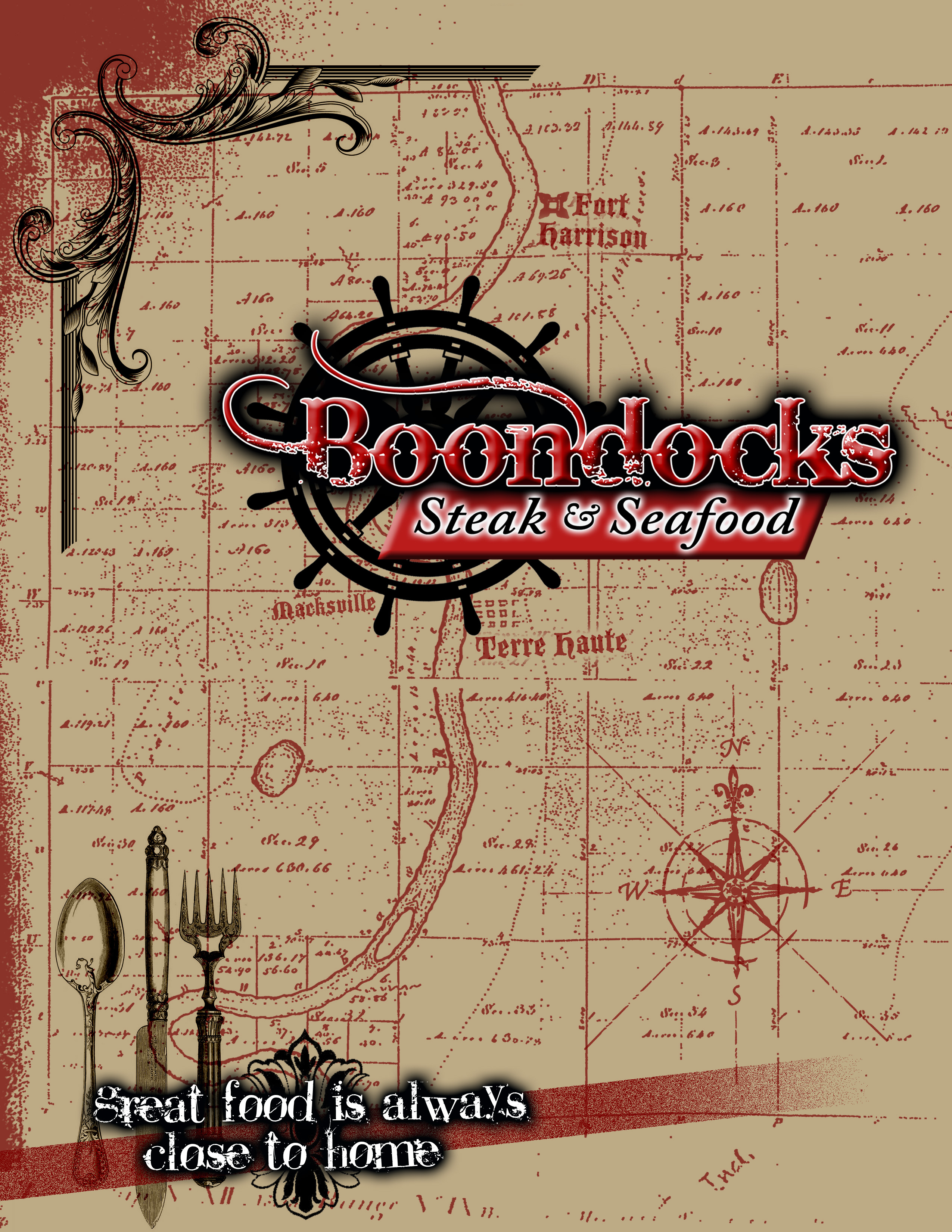 Menu cover design for Boondocks Steak & Seafood restaurant. I supplied this client with a consistent brand, new restaurant & marketing concepts and unique food recipes to revive years of negative public relations in their area.